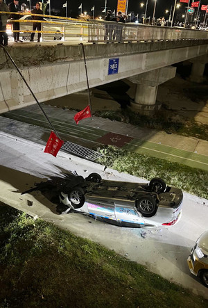 주행 중이던 택시가 다리 아래로 추락해 70대 운전자가 크게 다쳤다.경찰과 소방당국에 따르면 지난 1일 밤 8시 59분쯤 영주시 가흥동 제2가흥교에서 택시 한 대가 교량 난간을 들이받고 약 3m 아래 산책로 방향으로 추락하는 사고가 발생했다.이 사고로 운전자인 70대 남성이 머리와 다리를 크게 다쳐 안동병원으로 옮겨졌다.당시 교량 위를 주행하던 사고 택시를 다른 차량이 추돌하면서 갑자기 방향을 이탈해 난간을 들이받고 추락한 것으로 알려졌다. 차량은 심하게 파손됐다.현장에 출동한 119구조대가 운전자를 구조해 병원으로 이송했다. 경찰