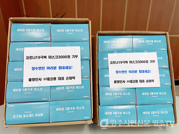 영주시 장수면 출신 출향인사인 손태락 ㈜데코원 대표가 5일 ‘코로나19’ 극복을 위해 써 달라며 장수면 행정복지센터(면장 김만기)에 마스크 3천장을 기부했다. 기부된 마스크는 장수면 관내 독거노인 등 취약계층을 대상으로 배부될 예정이다.