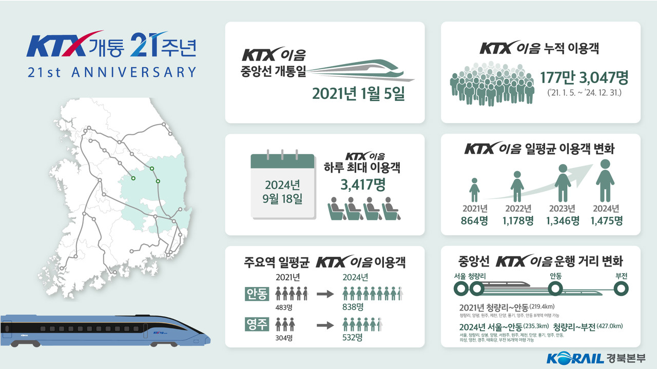 한편 KTX는 2004년 4월 1일 국내에 첫 개통돼 올해로 21주년을 맞았다. KTX-이음은 그 연장선상에서 중부내륙의 교통을 책임지고 있다. 특히 서울~안동~부산을 잇는 축은 향후 관광과 산업 물류 확대에도 긍정적 영향을 줄 것으로 보인다.