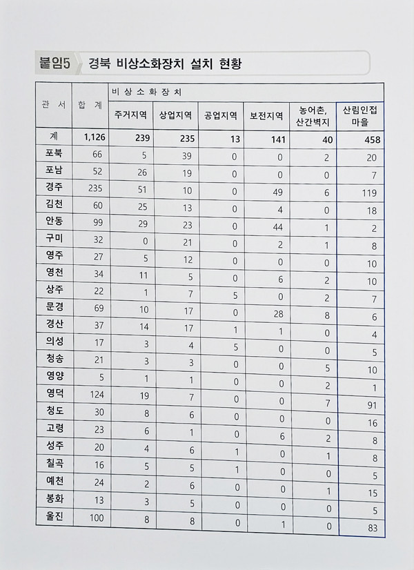 지난해 기준, 영덕에는 91개가 설치됐지만 안동 2기, 의성 5기, 청송 10기, 영양 1기뿐이다. 우리고장 영주도 고작 10기 뿐이다. 울산 울주는 단 1기도 없다. 좁은 골목길, 외딴 마을 특성상 소방차 진입조차 어려운 현실에서, 주민들의 손에는 아무런 ‘도구’도 쥐어지지 않은 것이다.