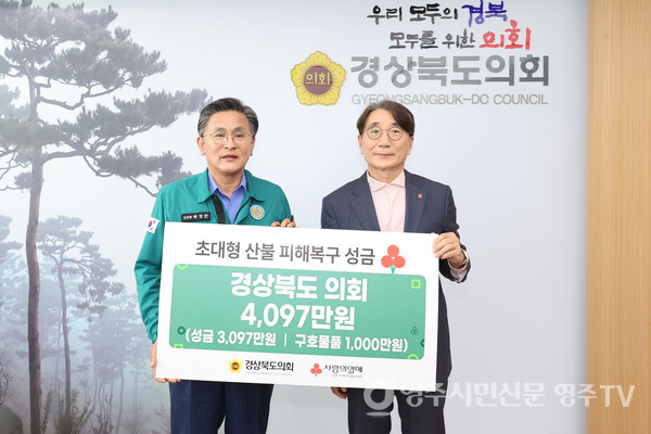 이번에 전달된 지원금은 ▲경북도의회 전체 의원과 의회사무처 전 직원이 자발적으로 모금한 성금 2천97만 원 ▲대한민국시도의회의장협의회 재난구호금 1천만 원 ▲이재민 지원을 위한 긴급 구호물품 1천만 원 상당으로 구성됐다.