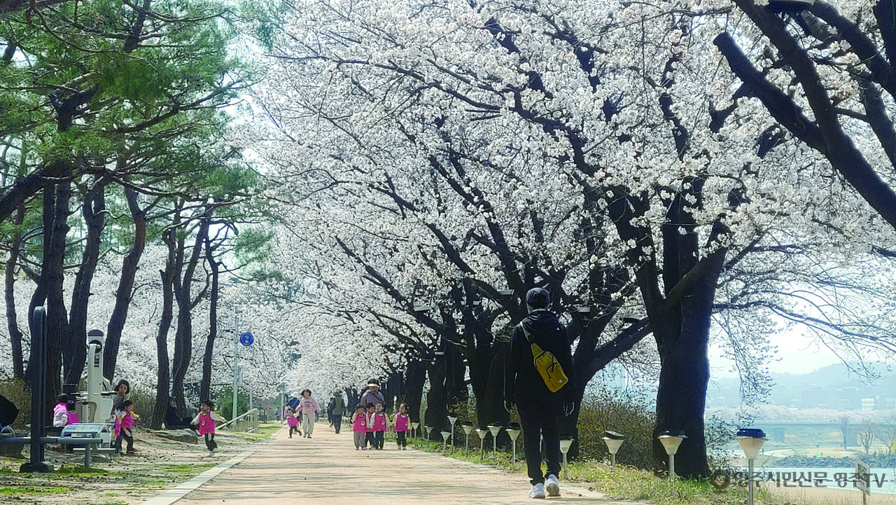 서천둔치 벚꽃길이 만개했다. 환한 벚꽃 아래 아이들이 쏟아져 나왔다. 분홍색 조끼를 입은 유치원생들이 선생님 손을 잡고 걸음을 맞춘다. 일부 아이들은 활짝 열린 길에서 마음껏 달린다.