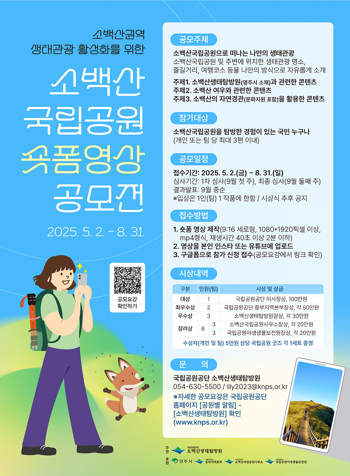 소백산생태탐방원(원장 이진철)이 ‘소백산국립공원 생태관광 숏폼 영상 공모전’을 연다. 이번 공모전은 소백산권역 생태관광을 활성화하고, 생태적 가치와 관광자원으로서의 우수성을 널리 알리기 위해 마련됐다.