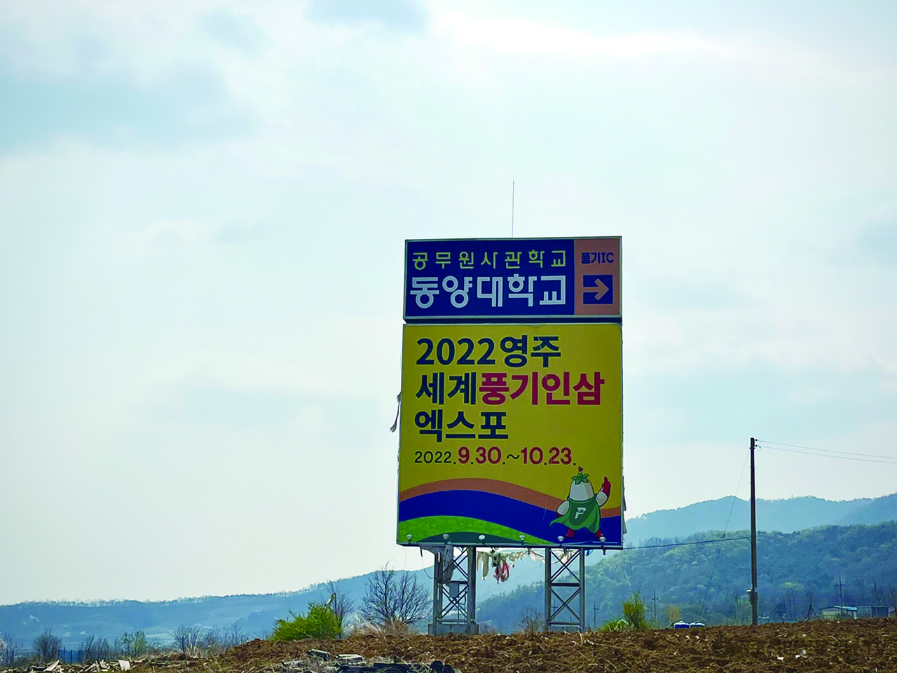 4월 말 현재, 중앙고속도로 부산 방향 풍기IC 부근에 설치된 대형 광고판에는 이미 종료된 ‘2022 영주세계풍기인삼엑스포(2022.9.30.~10.23.)’ 홍보 문구가 여전히 게시돼 있다. 행사 종료 이후 2년이 지난 지금까지도 철거되지 않은 채 방치돼 있어 도심 미관과 정보 전달의 적절성 문제를 지적하는 목소리가 나오고 있다.