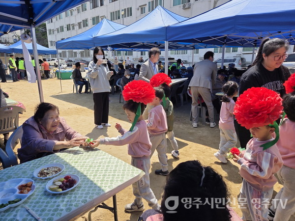 보현어린이집 원생들이 직접 만든 카네이션을 어르신들께 달아드리는 순서도 마련됐다. 소머리국밥, 고기, 문어, 과일 등 지역 주민들이 정성껏 준비한 음식이 훈훈한 분위기를 더했다.
