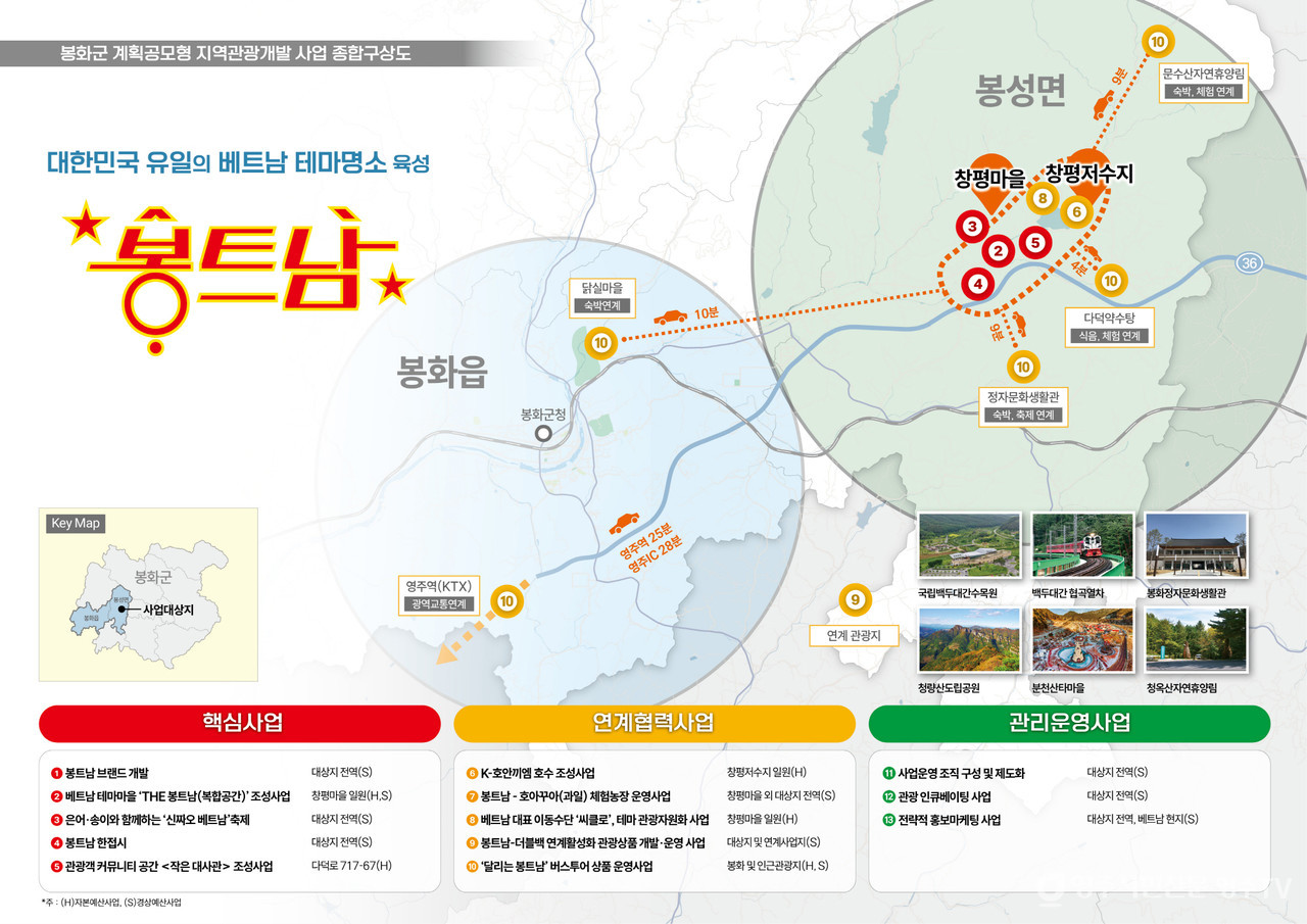 봉화군은 이번 사업을 통해 관광을 집중 육성하고, 현재 추진 중인 K-베트남밸리 조성사업과 교육·경제 분야 사업까지 연계해 시너지 효과를 낼 계획이다. 올해 기본계획을 세운 뒤 오는 2029년까지 연차별로 사업을 추진한다.