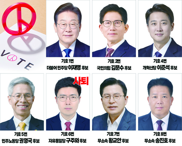 이번 선거에는 모두 6명이 후보로 등록했다. 등록된 후보는 기호 순서대로 △1번 더불어민주당 이재명(60) △2번 국민의힘 김문수(73) △4번 개혁신당 이준석(40) △5번 민주노동당 권영국(61) △7번 무소속 황교안(68) △8번 무소속 송진호(57)다. 원내 3당인 조국혁신당은 후보를 내지 않아 기호 3번은 공란으로 남게 됐다.