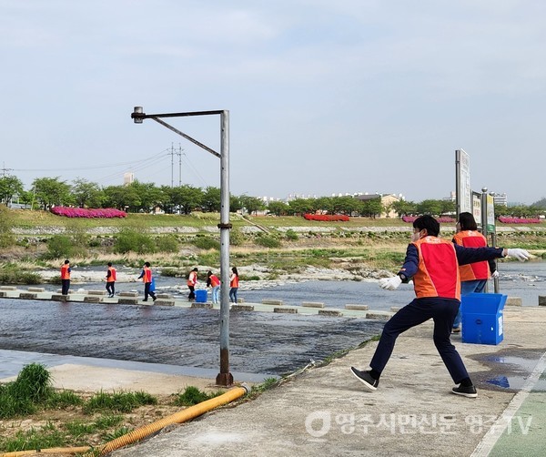 이날 봉사단은 서천 상류에서 EM흙공을 던진 뒤, 주변 쓰레기를 줍는 플로깅 활동을 이어갔다. 1시간여 동안 진행된 활동에는 임직원들이 자발적으로 참여해 서천의 수질 개선과 깨끗한 환경 조성을 위해 힘을 모았다.