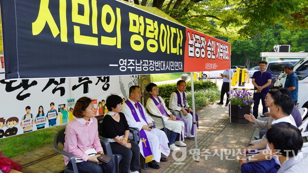 이날 단식에 나선 이들은 내매교회 윤재현 목사(영주기독시민연합 대표), 성민교회 호대원 목사, 성공회영주교회 천제욱 신부, SK스페셜티 노동조합 김현민 위원장, 영주시민연대 이화숙 공동대표와 강화숙 사무국장 등 6명이다.