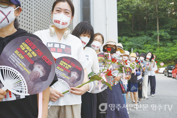 지난 7월 1일부터 일부 여성 시민들이 매일 아침 장미 한 송이를 들고 영주시청 앞에 섰다. 목소리는 없었지만, 장미와 손편지로 조용히 납공장 반대의 뜻을 밝힌 것이다. 새로 부임한 부시장(시장권한대행)에게는 1인 피켓 시위한 분들이 장미꽃 세 송이와 함께 진심이 담긴 손편지를 전하며 장미의 꽃말 ‘사랑의 시작’처럼, “영주시민과 아름답고 행복한 사랑을 시작해달라”는 메시지를 전하기도 했다. 3차 궐기대회 이후에는 분홍 장미 바구니와 손편지 보드도 함께 전달하며 침묵 속에서 강한 의지를 표현해 이목을 끌었다.