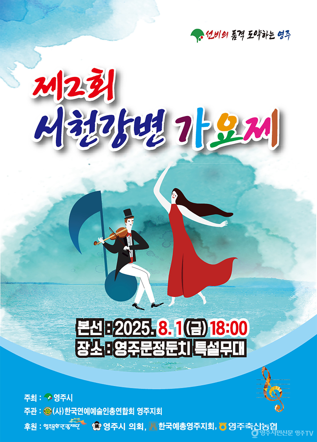 영주시가 주최하고 한국연예예술인협회 총연합회영주지회(지회장 조종호)가 주관하는 이번 가요제는 지역의 여름 대표 축제인 ‘2025영주 시원(ONE)축제’의 첫날을 장식하는 주요 행사로, 지역 예술문화의 대중성과 흥행성을 결합한 무대로 선보일 예정이다.