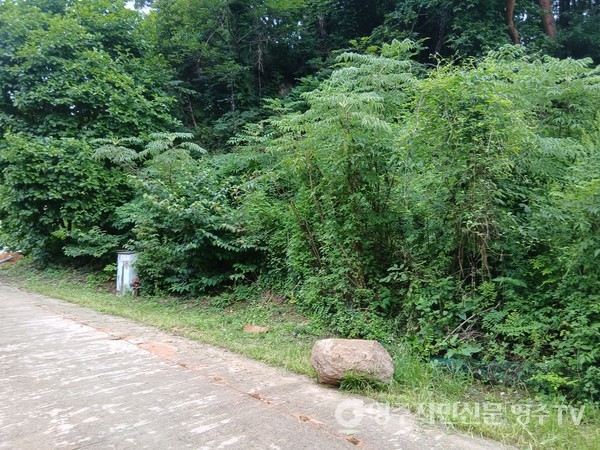영주시 문수면 수도리 산4번지, 무섬마을 뒷산에 있는 속칭 ‘탕관 바위’ 일부가 무너져 주민들이 시의 미온적인 대응을 질타하고 있다.