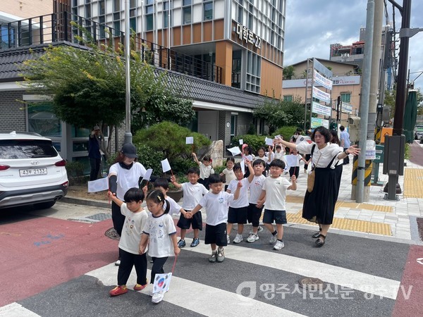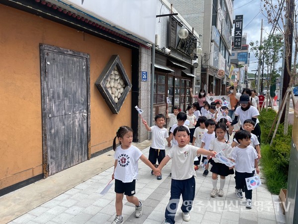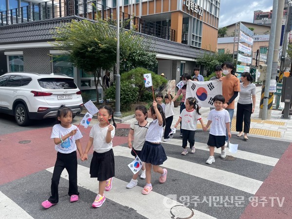 영주시 휴천2동(동장 류대하)이 14일 남산어린이집(원장 이인기) 원아들과 함께 광복 80주년 기념 거리 캠페인을 벌여 눈길을 끌었다.