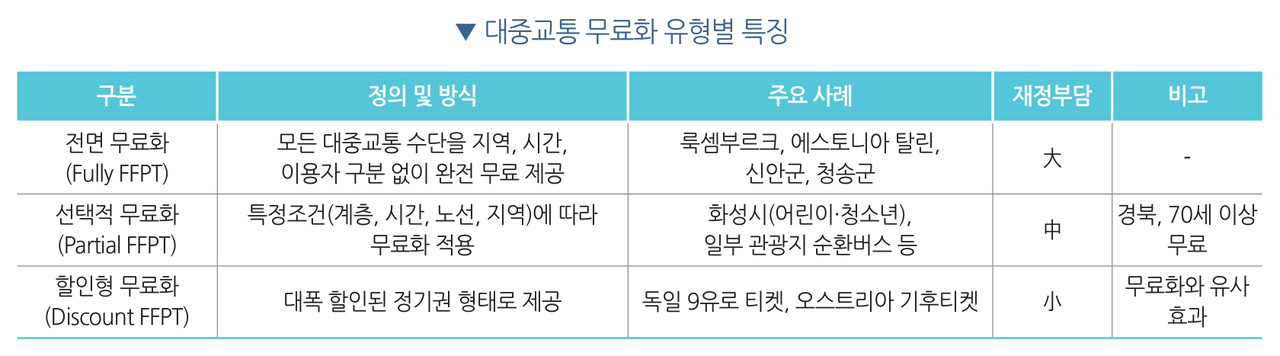 국내에서도 다양한 방식이 시도되고 있다. 전남 신안군은 2019년부터 시내버스와 여객선을 모두 무료화했고, 이용객은 30%, 관광객은 15% 늘었다. 경기도 화성시는 2022년부터 어린이·청소년을 대상으로 무료화를 시행해 대상 계층 이용률이 40% 이상 증가했다.