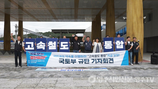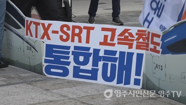 영주지방본부는 “대통령의 대선 공약인 고속철도 통합이 국토부의 꼼수로 지연되고 있다”며 “교차운행이나 운영통합은 본질적인 대책이 아니다”라고 주장했다.