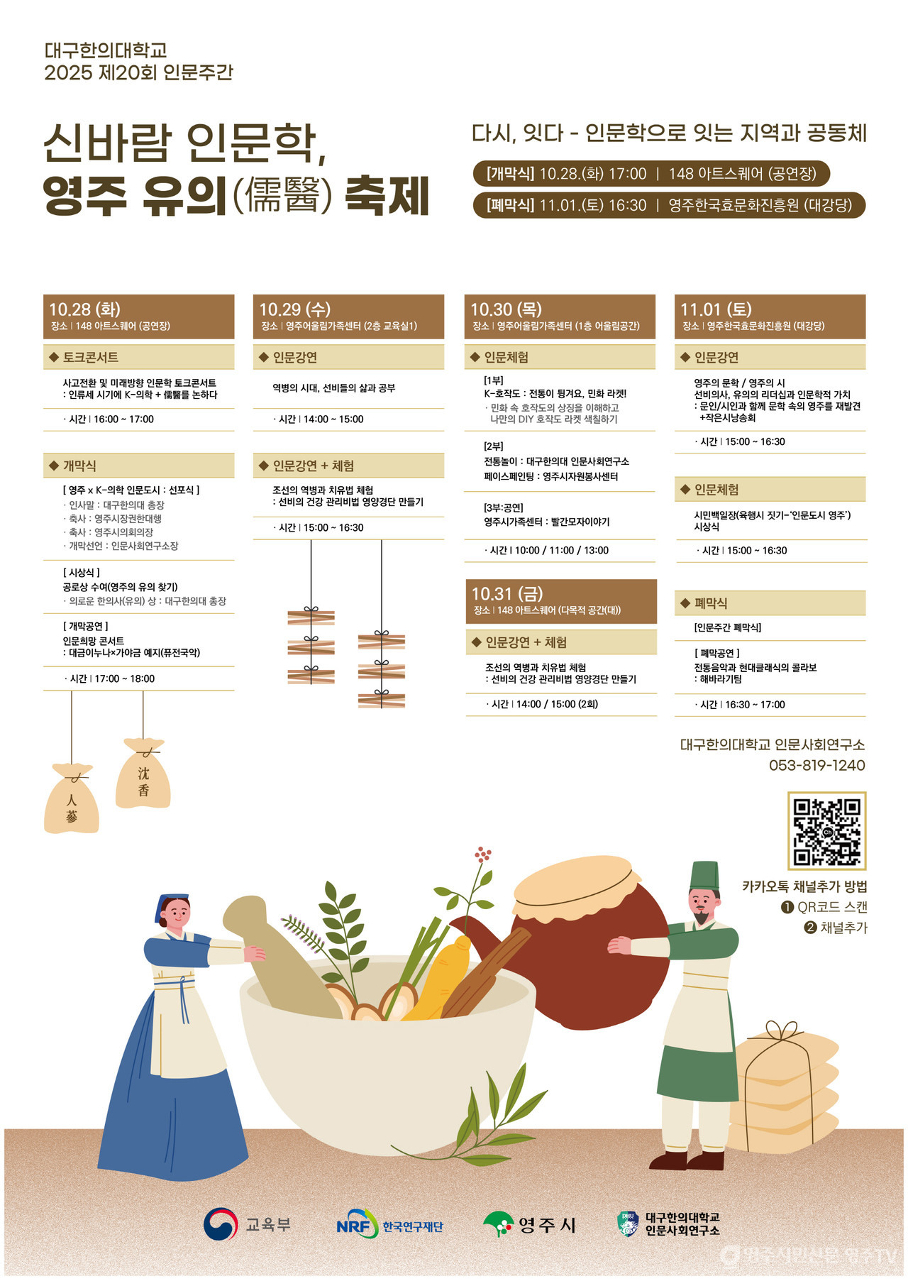 영주시가 오는 28일부터 다음달 1일까지 5일간 ‘2025 인문도시 지원사업’의 일환으로 인문주간 행사를 연다. ‘신바람 인문학, 영주 유의(儒醫)’를 주제로 펼쳐지는 이번 행사는 대구한의대학교와 공동으로 주관하며, 148아트스퀘어, 영주어울림가족센터, 한국효문화진흥원 등에서 열린다.