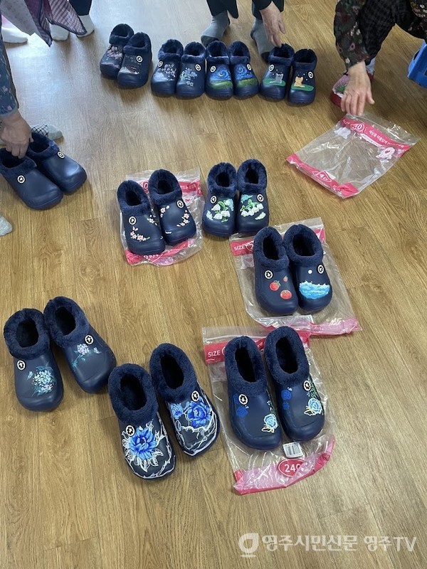학생들은 털신에 직접 그림을 그리고 새롭게 디자인해 안정면 용주로 마을회관에서 열린 전달식에서 어르신들께 털신을 선물했다.