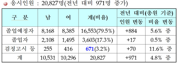 도내 고3 학생 수 증가가 전체 응시자 증가에 영향을 준 것으로 분석된다. 졸업 예정자는 전년 대비 5.6% 늘었고, 졸업생과 검정고시 출신도 각각 0.5%, 11.6%씩 증가했다.