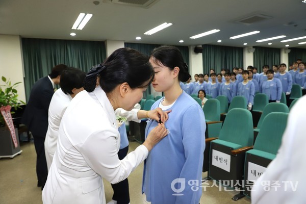 동양대학교 간호대학이 지난 7일 영주캠퍼스 다산관에서 ‘2025학년도 제13회 간호대학 휘장수여식’을 열었다. 이번 행사는 간호학과 2학년 학생들이 임상실습을 앞두고 간호전문인으로서의 소명과 책임을 다짐하는 자리로 마련됐다.