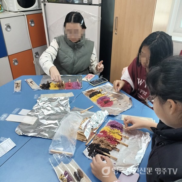 이번 활동은 농업인의 날(11월 11일)을 맞아 지역 어르신께 우리 농산물의 소중함과 따뜻한 마음을 함께 전하기 위해 마련됐다. 학생들은 호박·자색고구마·영주 쌀 등을 활용해 직접 초콜릿을 녹이고, 막대 과자에 5가지 크런치 가루를 입혀 꾸미는 작업을 했다. 여기에 한글 모양의 초콜릿과 전통 간식인 가래떡까지 포장해 10일 휴천2동과 풍기 지역의 어르신 10가구, 노인복지센터에 전달했다.