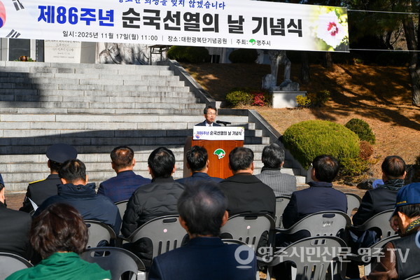 영주시가 제86주년 순국선열의 날을 맞아 지난 17일 풍기읍 대한광복단기념공원 추모탑 광장에서 기념식을 열고, 나라를 위해 희생한 순국선열들의 숭고한 뜻을 기렸다.