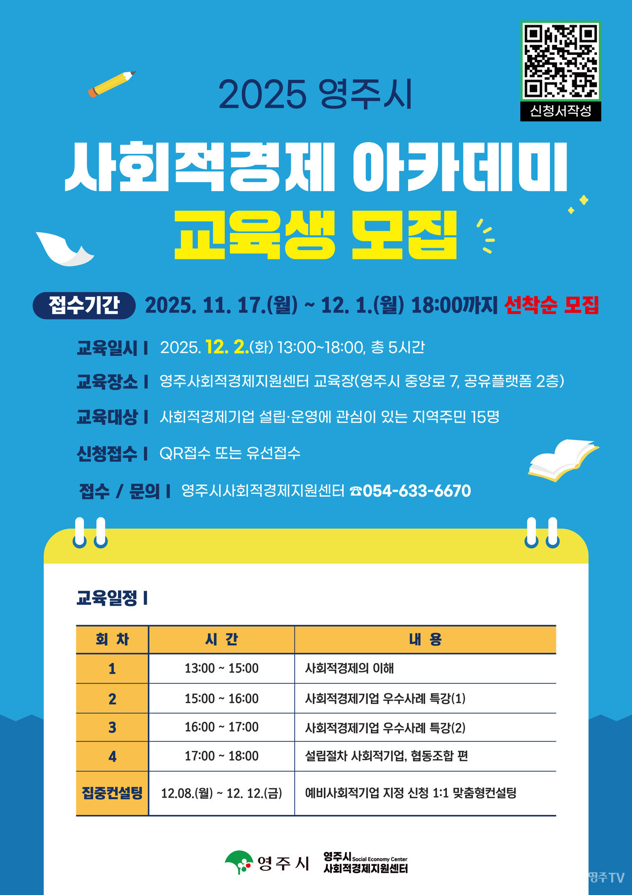 교육생 모집에 관한 세부 내용은 영주시사회적경제지원센터 홈페이지에서 확인할 수 있다. 신청은 12월 1일 월요일까지 포스터에 있는 QR코드(네이버폼) 또는 전화(☎ 054-633-6670)를 통해 가능하다.