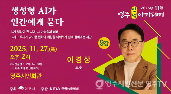 시는 오는 27일 목요일 오후 2시, 영주시민회관에서 KAIST 이경상 교수를 초청해 ‘11월 영주인성아카데미’를 연다고 밝혔다.