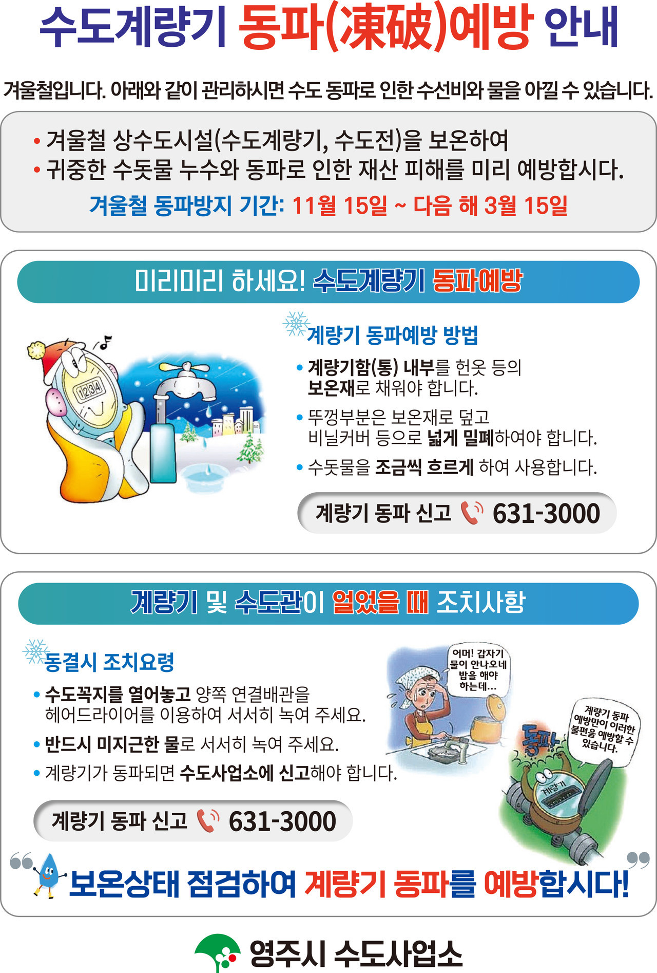 영주시가 지난 24일, 겨울철 한파로 인한 상수도 시설 동파 피해를 막기 위해 '2025년 겨울철 수도시설 동파 방지 대책'을 마련하고 집중 홍보에 나선다고 밝혔다.
