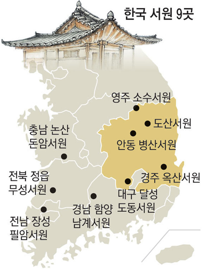 선비들은 책에서만 배움의 길이 있다고 생각하지 않았던 것 같다. 공부할 때는 물론, 문을 드나들고, 잠을 자고, 휴식을 취하는 순간에도 흐트러짐 없는 선비들의 마음자리가 서원 곳곳에 남겨 두고 있는 것이다. 서원의 모든 공간에 교육 철학과 수련 목표가 담겨 있는 것도 이 때문이다. 선비들은 배움의 목표를 강당의 당호(堂號)로 새기는 작업도 게을리 하지 않았다. 도산서원의 ‘전교당’, 돈암서원의 ‘응도당’, 남계서원의 ‘명성당’처럼 소수서원의 ‘명륜당’은 교육을 행함으로 인륜을 밝히겠다는 굳은 의지를 내포하고 있다. 직방재, 일신재도 마찬가지다. 학구재, 지락재도 매 한가지이다. 이런 다짐으로 400여 년을 지속해 온 우리 민족의 전통문화 자산이자, 정신문화의 산실인 서원은 현재 전국에 600여 개가 분포하고 있다. 그 중 9개 서원이 이번 세계유산 등재를 신청해 두고 있다.