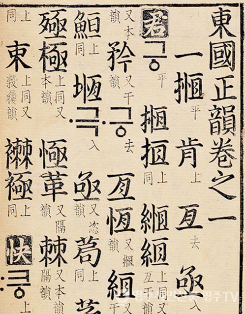 『동국정운』 세종 30년(1448)에 당대 최고의 학자 9명(신숙주·최항·성삼문·박팽년·이개·강희안·이현로·조변안·김증)과 진양(수양)대군·안평대군이 합세하여 한국 역사상 처음으로 한자 음을 『훈민정음』으로 기록한 문서이다. 그러므로 『동국정운』의 가치를 따로 헤아릴 수가 없어 전문가들은 또 다른 『훈민정음』이라고 표현한단다. 그런 중요성에 비추어 초간본 2종류는 일찌감치 대한민국 국보 제71호, 제142호로 지정되어 보호되고 있다.